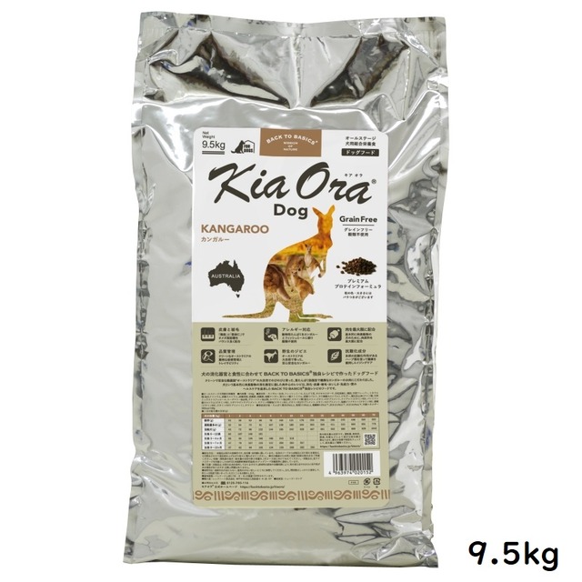 オーストラリアの大自然で育った野生の「カンガルー」は、低脂肪、高タンパク、低コレステロールです。 Kia Ora? が使用するカンガルーは、体にやさしい赤身の健康食肉で、ルーミートと呼ばれ、最近ではベニソンに代わる新奇たんぱく源として注目されています。 [商品名] KiaOra DOG カンガルー [内容量] 9.5kg [成分値] たんぱく質 29.0%以上 脂質 17.0%以上 粗繊維 4.0% 以下 灰分 10.0% 以下 水分 10.0% 以下 [カロリー] 365kcal/100g [原材料] カンガルー生肉、ドライフィッシュ、えんどう豆、タピオカスターチ、全粒亜麻仁、鶏脂、天然フレーバー、ミネラル類(塩化ナトリウム、炭酸カルシウム、硫酸亜鉛、硫酸鉄、硫酸銅、硫酸マンガン、亜セレン酸ナトリウム、硫酸コバルト、ヨウ素酸カルシウム)、ビネガー、酸化防止剤(クエン酸、天然ミックストコフェロール、ローズマリー抽出物、グリーンティ抽出物、スペアミント抽出物)、ビタミン類(塩化コリン、ビタミンEサプリメント、ナイアシン(ビタミンB3)、パントテン酸カルシウム(ビタミンB5)、リボフラビンサプリメント、チアミン硝酸塩(ビタミンB1)、ビタミンB12サプリメント、ビタミンAサプリメント、塩酸ピリドキシン(ビタミンB6)、葉酸(ビタミンB9)、ビタミンD3サプリメント)、タウリン [備考] ◆全犬種に対応したフードです。 ◆総合栄養食 本品は、ペットフード公正取引協議会が定める分析試験により、幼犬、成長期の犬、妊娠犬・授乳犬に適したバランスの良い総合栄養食の基準を満たすことが証明されています。 ◆AAFCO栄養基準 本品は、AAFCO(米国飼料検査官協会)規定の分析試験により、幼犬、成長期の犬、妊娠犬・授乳犬の健康維持に適したバランスの良い総合栄養食であることが証明されています。 ◆保存方法 直射日光の当たらない、湿気の少ない涼しいところに保管してください。また、開封後はしっかりと密封して、約1ヶ月程度で使いきっていただくことをお奨めします。 [配送について] 常に最新賞味期限にてお届けできるよう、メーカー取り寄せにて対応しております ご注文いただいてから5営業日前後のお届けとなります ※お届け先が遠方、離島等の一部地域の場合等はさらに数日を要する場合がございます。 その他、天候や配送状況により納品が遅れることがございます。 ※年末年始・夏季休業については、N-food. BASE店ホームまたは公式LINEよりご確認ください [キャンセル・返品について] ・商品発送後のキャンセルはお受けすることができません ・お客様の都合による返品は原則お断りしています ①明らかな不良品、性質に問題がある場合 ②当店の過失によりお客様が注文した商品と相違する商品が届けられた場合 上記に該当する場合、商品到着日より7日以内にお問い合わせフォームからご連絡願い致します この期間を過ぎた場合、返品はお受けすることができません -------------------- ●オーストラリア産、貴重な新奇たんぱく源「カンガルー」 オーストラリアは野生動物が豊かに育つ世界有数の自然大国です。自然の草を食べてのびのびと育ったカンガルーは、オーストラリア特有のジビエで高たんぱく低脂肪のヘルシーなお肉です。また、非常に厳しい防疫管理及び法規制で守られており、国内の家畜にはBSE(牛海綿状脳症)、口蹄疫といった疫病がない非汚染国です。 ●肉原料を最大限に、食部原料を最小限に配合し、穀類不使用だから食物アレルギーにも配慮 肉食動物の食べ物ではない、果物や野菜などのイメージ原料を排除し、お肉を最大限配合しました。また、すべての肉原料は薬剤を使用していない自然放牧のお肉です。 動物性たんぱく源を「単一肉原料+ドライフィッシュ」に絞り、穀類は使用せず、食物アレルギーに配慮しています。 ●皮膚と被毛の健康をサポート 「鶏脂」と「亜麻仁」の最適なオメガ3&6脂肪酸をバランス良く配合することで、健康維持により美しい皮膚と被毛を保ちます。 ●自然の抗酸化成分で健康を維持する、エイジングケア 自然の抗酸化作用があるローズマリー、グリーンティ、スペアミントの抽出物を使い健康維持することで、エイジングケアをサポートします。 --------------------